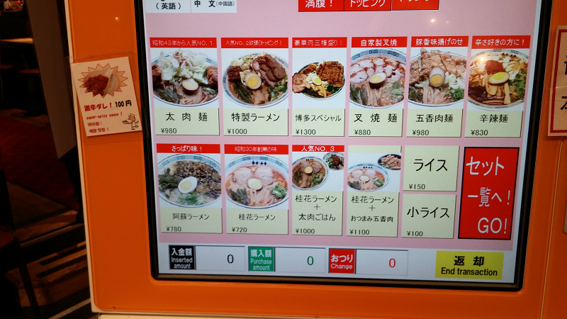 | 感想(コメント) | 丁度訪問したのが夕方の17時ごろだったのもあり、お客さんは少なかった。 とりあえず、本日は店名にもなっている桂花ラーメンを注文。 数分後に来ました。 スープは白湯スープでミルクのようにまろやかですっきりした味が特徴で飲みやすいスープでした。 麺はしこしこ麺で、長浜ラーメンを食べなれた私には少し抵抗がありました。 かなり歯ごたえのある麺でした。 具には玉子に、ネギ・チャーシュー・メンマがトッピングしていました。 お好みに合わせて激辛ダレなどをトッピングできます。 |