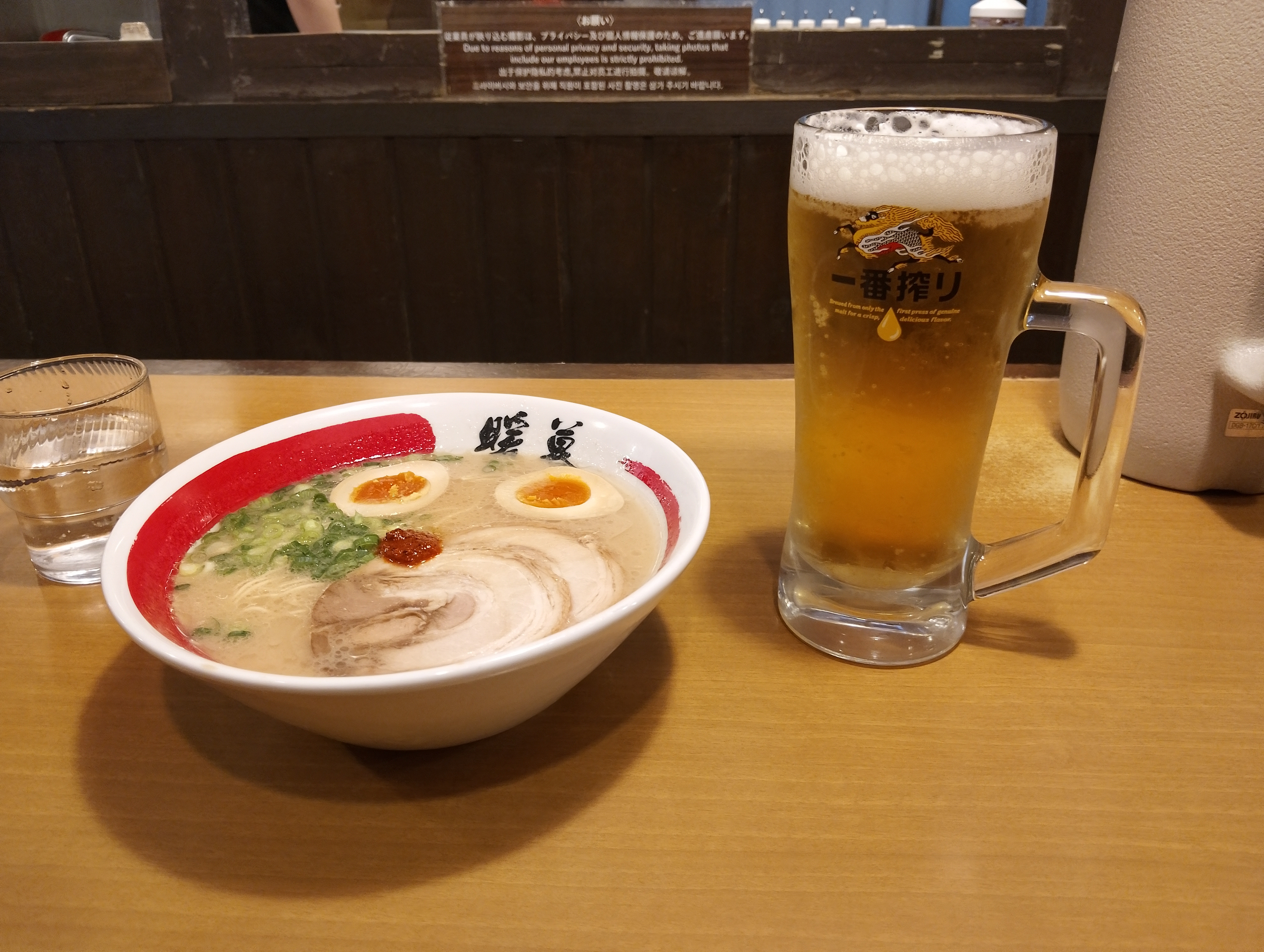 | 感想(コメント) | 大宰府天満宮に初詣に行くときにいつも利用している店です。 結構いつも行列が出来ていて今日も20分ぐらい待たされました。 場所は太宰府駅前の交差点にあり、九州ラーメン総選挙第一位という看板が目印です。 今日は一番人気の半熟煮玉子ラーメンを頂きました。 麺は細麺でスープは少し濃いめ、辛味タレは普通でとても美味しかったです。(^^)/ ビールと相性も抜群でした。 |